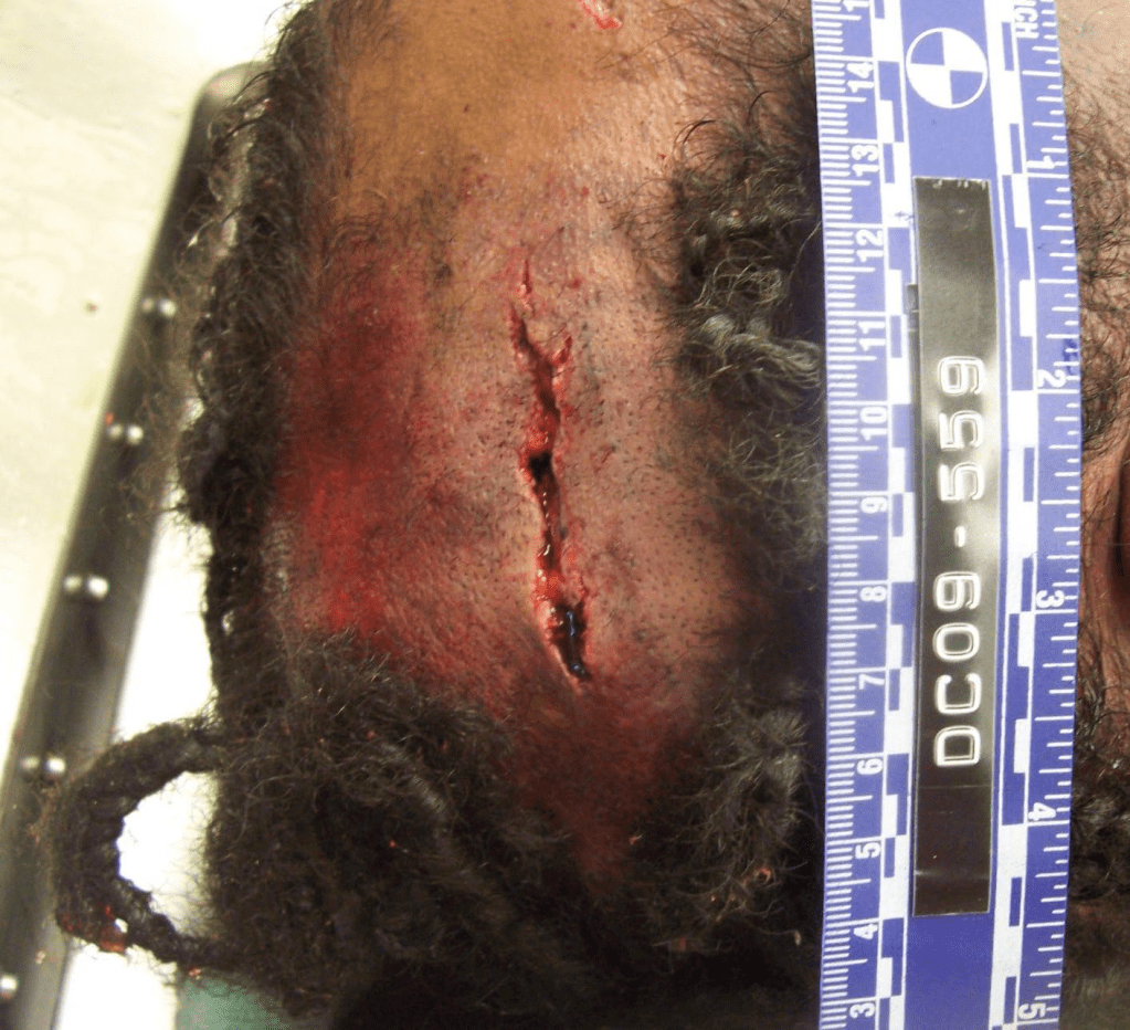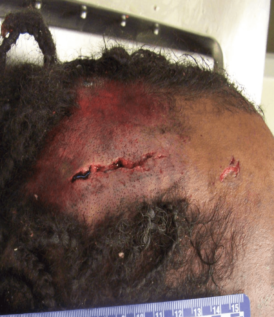 It is possible that Justin’s hair was pulled from his head, causing the subgaleal hemorrhaging. Patients with SGH may develop a headache, emesis (vomiting), drowsiness, or amnesia. Dr. Thomas did also note in her autopsy that Justin has “terminal aspiration of gastric contents”, meaning he inhaled or choked on his own vomit. His vomiting may have been induced by the subgaleal hemorrhage, not asphyxia due to mechanical compression of the recycling truck as described by Dr. Thomas in her final diagnosis. It is also possible that Justin’s asphyxia might be the result of choking on his own vomit as a result of the torn hair and subsequent hemorrhaging. See another photo right with another photo of the laceration to Justin’s scalp and the elaborate braids he had.
