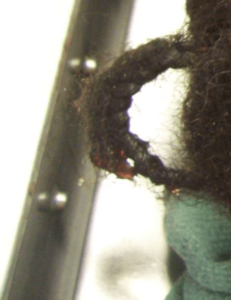 Justin Teigen was missing a 4 x 4 cm patch of hair on the right side of his head, above the laceration and the subgaleal hemorrhaging. Dr. Thomas described in the autopsy that Justin’s hair was braided in a very elaborate braided pattern. Yet, he is missing a 4 x 4 cm section of this elaborate braiding pattern and the braids adjacent to the wound look torn and loose. See the photos below for the area where hair was missing and note that in the lower left corner of the left photo, there is a loose braid that appears to have been torn. The right photo shows a close up of the torn braid, and what appears to be blood on the end.