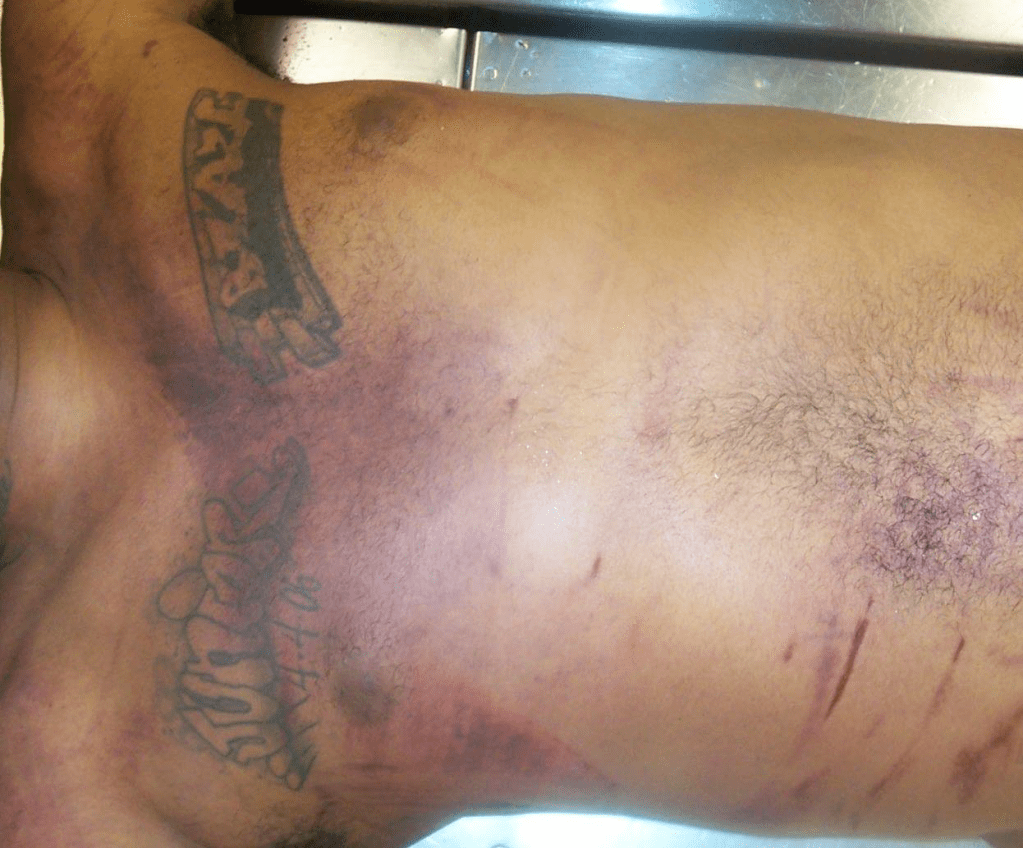 Justin had purple discoloration, or bruising, on his chest extended 5cm to the right of the right nipple across the center of the chest to the approximate center of the left clavicle in an area measuring 26 x 15 cm. See the photo below for the deep purple marks across his chest and the horizontal cuts across his waist that resemble a seatbelt injury.