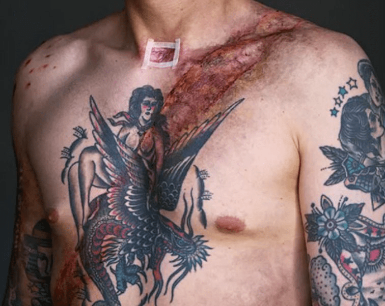 | 21. | 7cm above the knee is an inverted V-shaped injury in which there is blistering of the epidermis. This measures 5cm and 7cm x 0.3cm. |