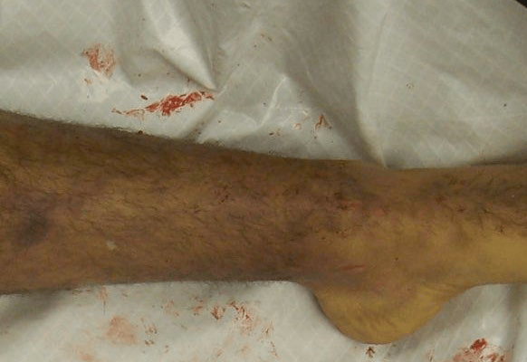 | 17. | On the medial aspect of the lower left leg 18cm below the knee is a 4 x 4cm area of purple-red discoloration. |