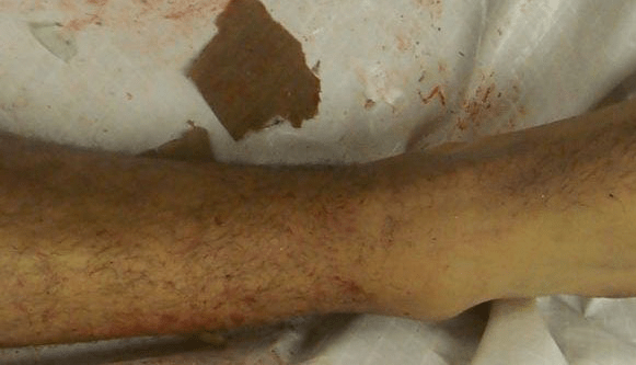 | 33. | On the anterior lower right leg 12 cm below the knee is a 9 x 4cm area of vague red discoloration in which there is a 5 x 4mm abrasion. |