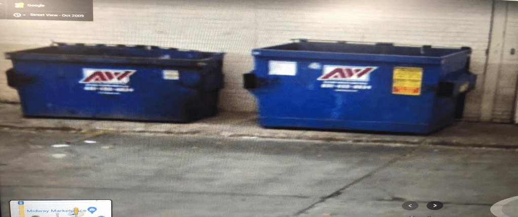 The two dumpsters along Pascal Street are facing east towards the Walmart positioned on a small sidewalk right up against the Midway building, so the lid is behind the dumpster and there is concern that Justin could close the lid. So, Officer Davis and Auggie could have had a very clear view inside of this dumpster.